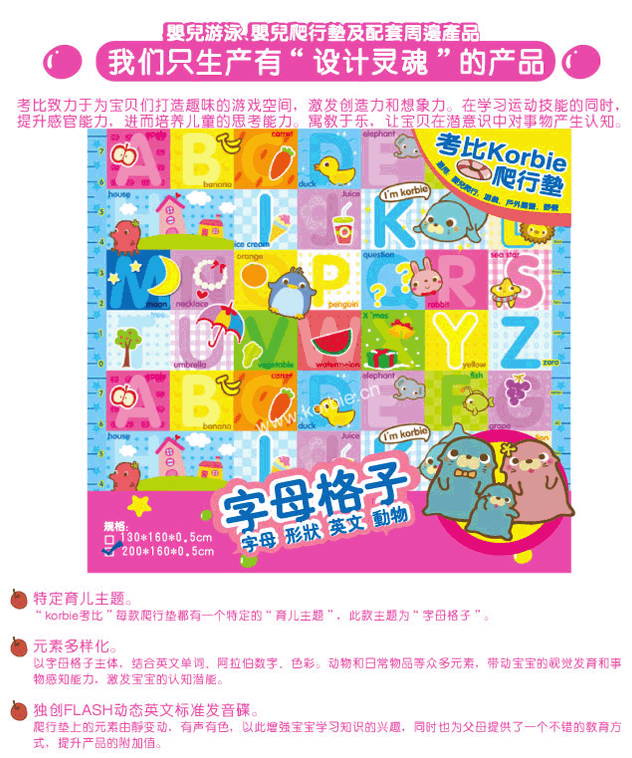 “考比Korbie”嬰兒爬行墊,是杭州杰弗瑞嬰童用品有限公司旗下的主打品牌產(chǎn)品。Korbie,源自德文“korb”,是“籃子”的意思?急菿orbie,給爸爸媽媽一個放心的“籃子”,為寶寶的成長創(chuàng)造一個安全、舒適和快樂的小天地。
