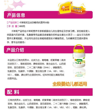 卡咪呢有機(jī)米粉系列是專為中國寶寶設(shè)計的營養(yǎng)輔食,選用有機(jī)大米,科學(xué)搭配維生素AD等維生素,還特別添加;撬、DHA、AA等有助智力發(fā)育的營養(yǎng)成分,富含15種營養(yǎng)素,F(xiàn)上海卡咪呢母嬰用品有限公司面向全國空白市場區(qū)域誠招卡咪呢有機(jī)米粉代理商。