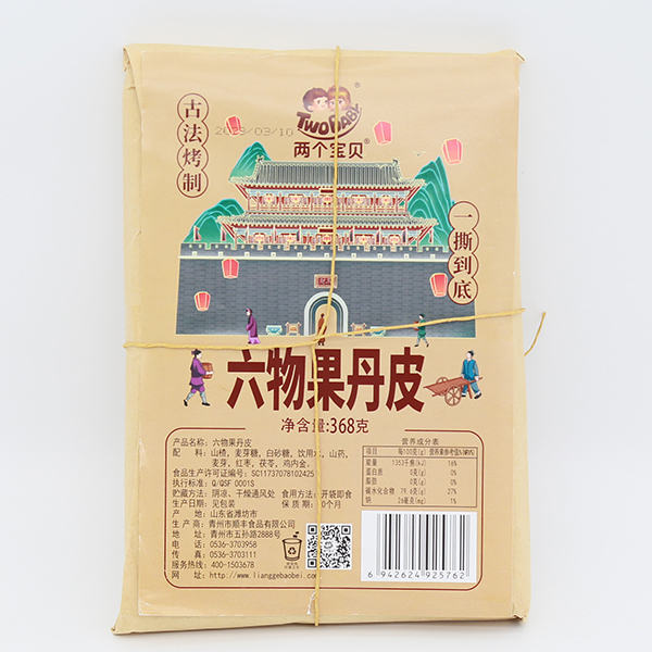 兩個(gè)寶貝六物果丹皮,傳承經(jīng)典,選用藥食同源食材:山楂、山藥、麥芽、紅棗、茯苓、雞內(nèi)金,古法烤制,六物合一,酸酸甜甜,自然好味道!大分量,更滿足,一撕到底!不添加香精、色素、防腐劑,吃的美味,吃的放心,吃出健康好胃口!