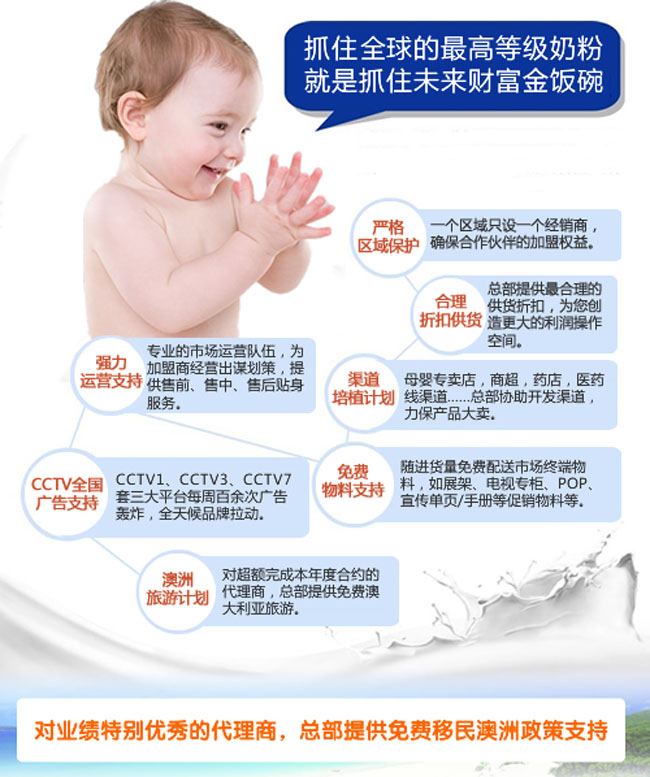 品牌名稱:澳特佳 主營產(chǎn)品:澳特佳嬰兒奶粉招商 品牌特色:天然 安全 不上火