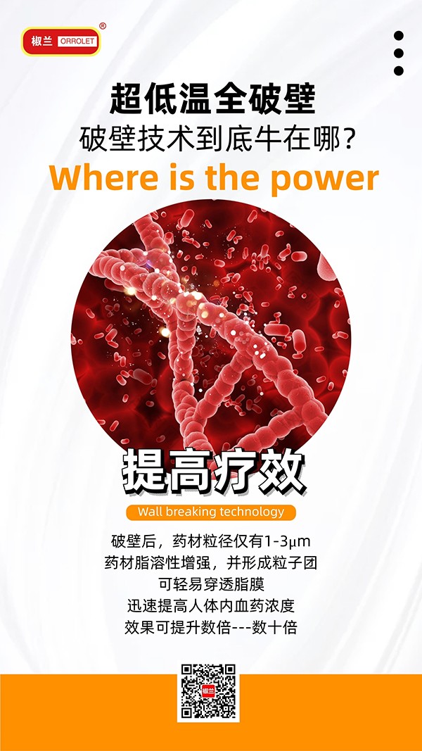 超低溫全破壁技術是一種國際尖端超微物理處理技術。在-40°c低溫條件下,將原生藥材完全脫水凍干,使藥材的細胞結構發(fā)生崩解。然后利用電子束沖擊藥材,同時利用電磁震蕩的交互作用,將藥材進行超微破壁粉碎,確保藥材細胞破壁率99%以上。經過納米技術處理后,藥材粒徑只有1-3μm,使脂溶性增強,并形成粒子團,可輕易穿過脂膜,迅速提高人體內血藥濃度,效果可提升數(shù)倍----數(shù)十倍!