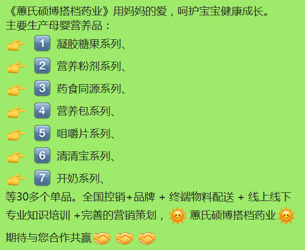 主要生產(chǎn)母嬰營養(yǎng)品∶凝膠糖果系列、營養(yǎng)粉劑系列、藥食同源系列、營養(yǎng)包系列、咀嚼片系列、清清寶系列、開奶系列、等30多個單品。全國控銷+品牌+終端物料配送+線上線下專業(yè)知識培訓+完善的營銷策劃,焱蕙氏碩博搭檔藥業(yè)燃期待與您合作共贏