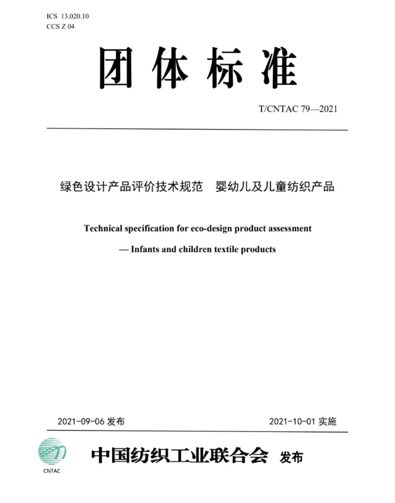 由中國紡織工業(yè)聯(lián)合會牽頭聯(lián)合多家嬰童服裝企業(yè)專家經(jīng)過3年多時(shí)間編制的“綠色設(shè)計(jì)產(chǎn)品評價(jià)技術(shù)規(guī)范—嬰幼兒及兒童紡織產(chǎn)品”團(tuán)體標(biāo)準(zhǔn)《T/CNTAC79-2021》已于2021年9月6日發(fā)布,并于2021年10月1日起實(shí)施,標(biāo)志著綠色童裝產(chǎn)品認(rèn)證啟動(dòng)!
