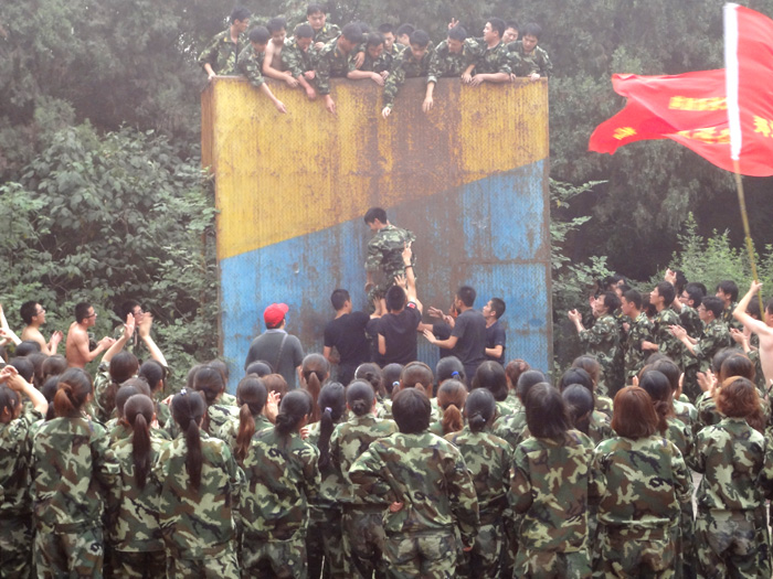 拓展訓(xùn)練中隊員勇攀畢業(yè)墻