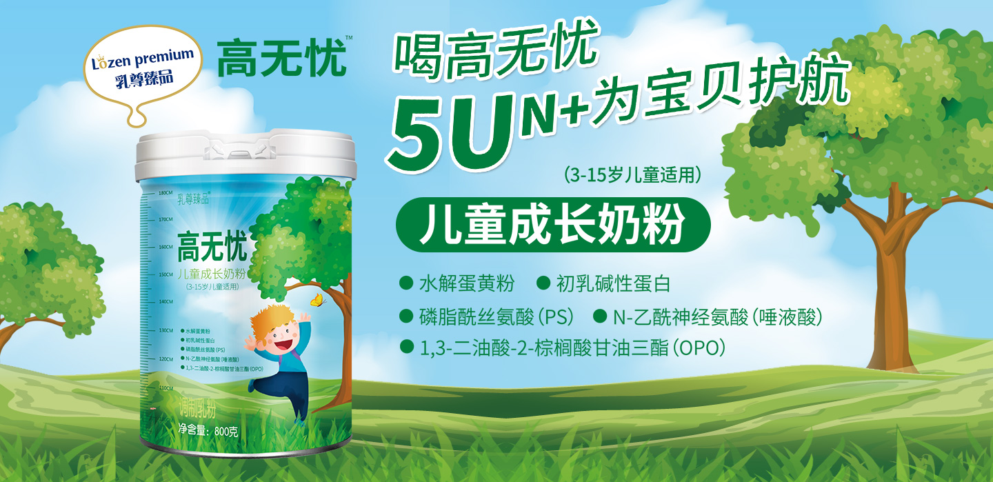 高無憂兒童成長奶粉,5U組合,全面均衡,助力體智活力齊發(fā)展。34種營養(yǎng),15種維生素,9種礦物質(zhì),全面均衡營養(yǎng),激發(fā)孩子全面成長力;(FOS+GOS+IMO)益生元+OPO組合,輕松消化營養(yǎng)好吸收;特添加CBP+水解蛋黃粉,激活骨骼生長原動力。濕法工藝,2小時鎖鮮,營養(yǎng)均勻,先進(jìn)工藝,鑄就高品質(zhì),給兒童帶來“一站式”營養(yǎng)補(bǔ)充,為廣大家庭提供更科學(xué)的哺喂方案。